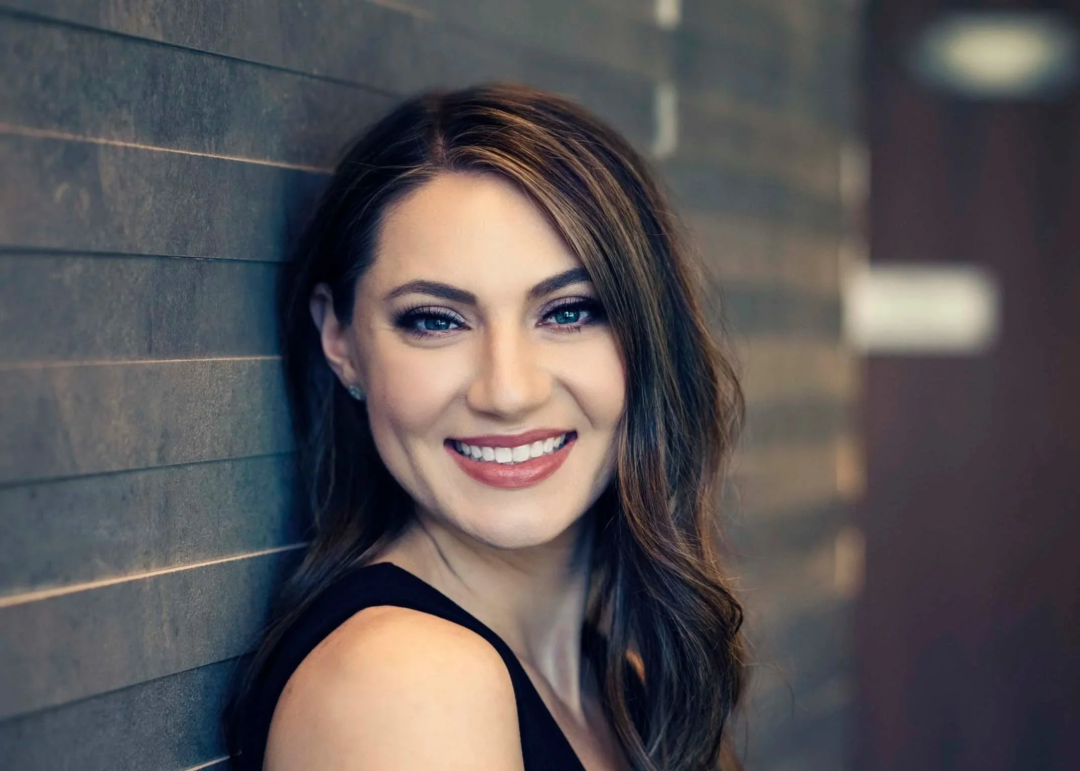 A smiling woman with blonde hair sitting on a sofa in front of a large green plant.